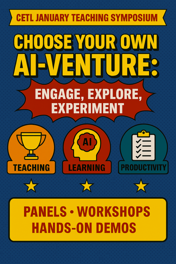 Join us on January 21st for a dynamic one-day teaching and learning symposium designed for faculty ready to explore the power and possibilities of AI in teaching, learning, and productivity. Get ready to Choose Your Own AI Adventure and explore a rich mix of interactive tracks, hands-on labs, scenario-based challenges, and thought-provoking discussions. Whether you’re curious, cautious, or already experimenting with AI, this event will equip you with practical strategies, ethical insights, and creative inspiration to lead the way forward.