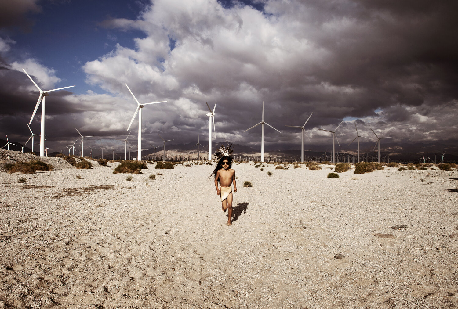 Indian Canyon, Kiyanni, and Winka & The Windmills are from the series “Jackrabbit, Cottontail & Spirits of the Desert,” whose subjects are Chemehuevi time travelers visiting the lands of the Cahuilla, Serrano, and Mojave people in what is now known as the Coachella Valley. In Indian Canyon, one of these mythical visitors perches on a rock amidst a rocky landscape, taking in the world around him. His gaze invokes feelings of the sublime, adventure, and the deep connection humans have with the land. In a video with Craft in America, Romero states the importance of including children in her work because “they carry the spirit of their ancestors with them.” These subjects are the physical entity of the longevity of Chemehuevi and Indigenous culture.