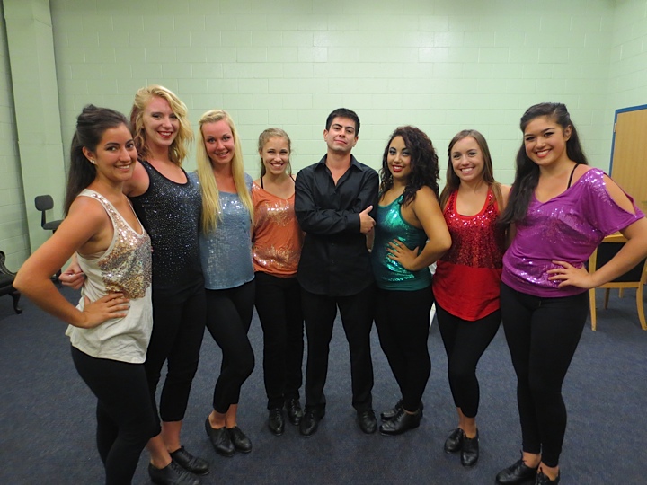 Chapman University Tap Ensemble members Laura Padilla (’14), Mandy Dray (‘14), Alanna Seitz (‘15), Shannon Mueller (‘12), Dante Lara (‘13), Gabby Bruno (‘14), Jenny Sicard (‘12), and Shelby LaRosa (‘13)