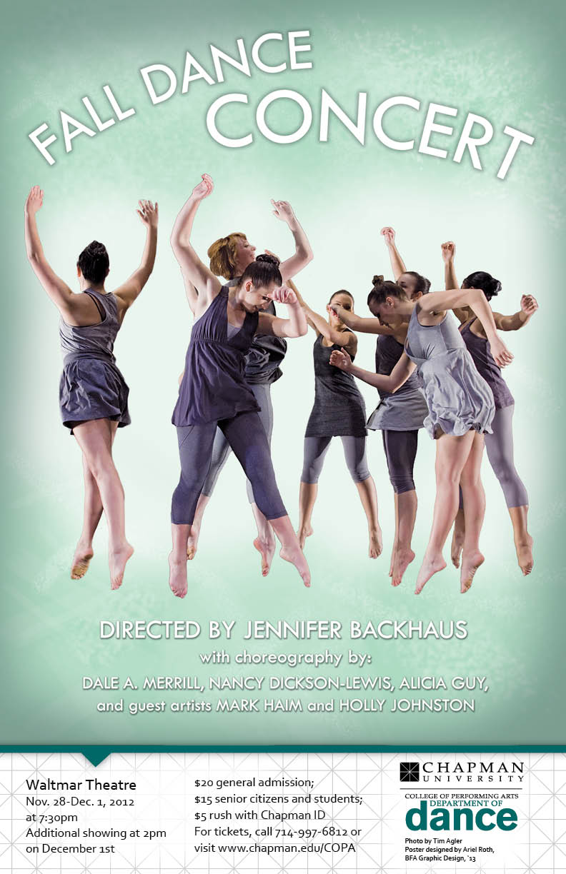 The Fall Dance Concert will be held in the Waltmar Theatre, November 28-December 1, 2012, at 7:30pm with an additional performance December 1 at 2pm. Tickets may be purchased by calling 714-997-6812 or visiting