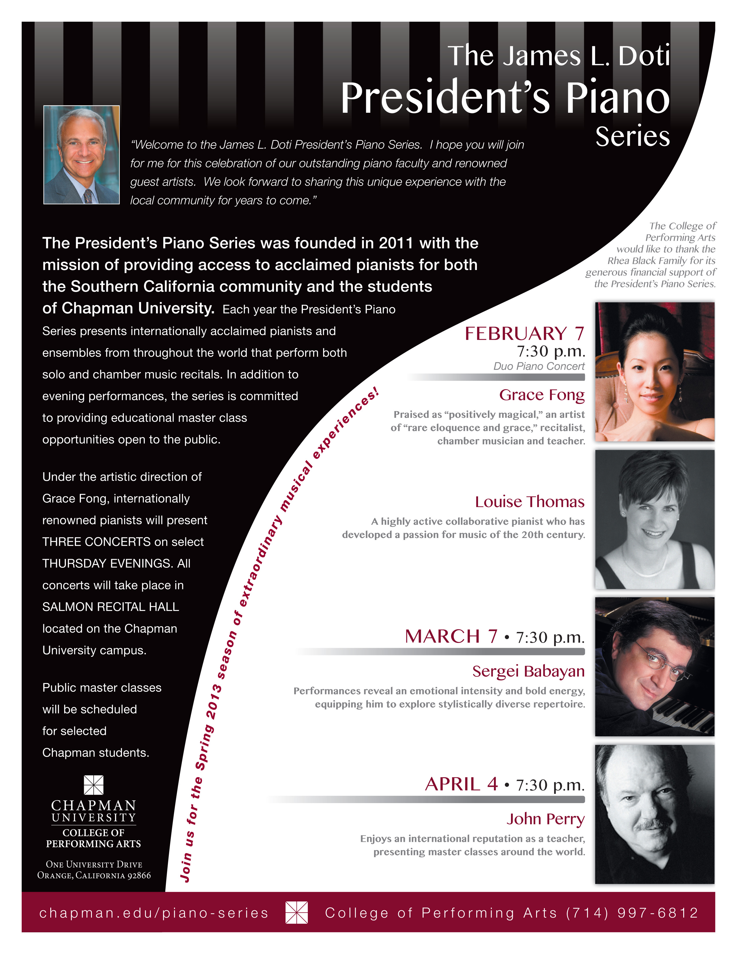 The James L. Doti President’s Piano Series was founded in 2011 with the mission of providing access to acclaimed pianists for both the Southern California community and the students of Chapman University. Under the artistic direction of Grace Fong, each year the President’s Piano Series presents internationally acclaimed pianists and ensembles from throughout the world that perform both solo and chamber music recitals. In addition to evening performances, the series is committed to providing educational master class opportunities open to the public. Public master classes will be scheduled for selected Chapman students.