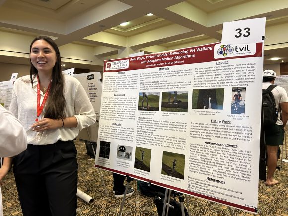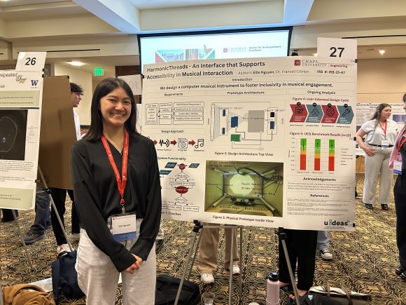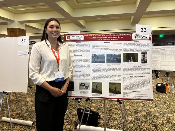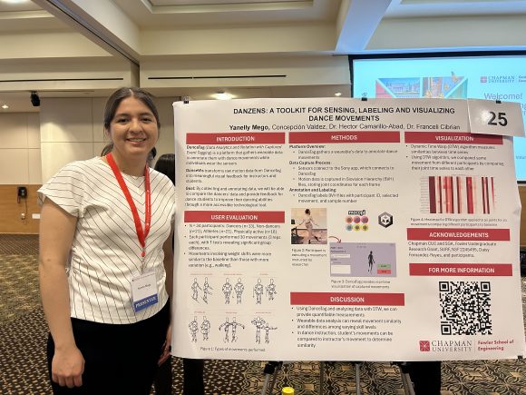 “Presenting my poster at the Spring Symposium gave me the chance to showcase all the effort and research progress I made throughout the semester,” said Yanelly Mego (Software Engineering ‘25), whose research into dance-centric wearable technologies was also displayed in the Leatherby Libraries. Additionally, Mego spent the summer of 2024 participating in Chapman University’s Summer Undergraduate Research Fellowship (SURF), using the time and resources to conduct her DanZens research.