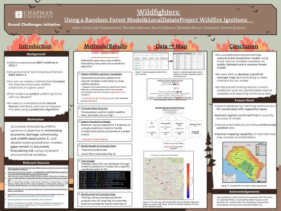 At our 2025 GCI Spring Showcase, a group of students presented a poster about a natural event prediction model that uses public datasets and a random forest model to predict wildfires.