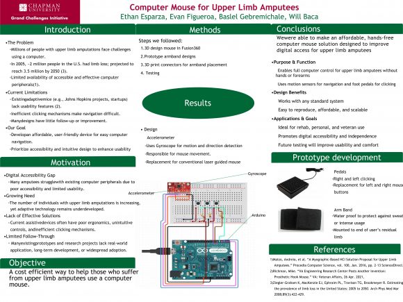 At our 2025 GCI Spring Showcase, a group of students presented a poster about an affordable, hands-free computer mouse that is accessible for those who are upper limb amputees.
