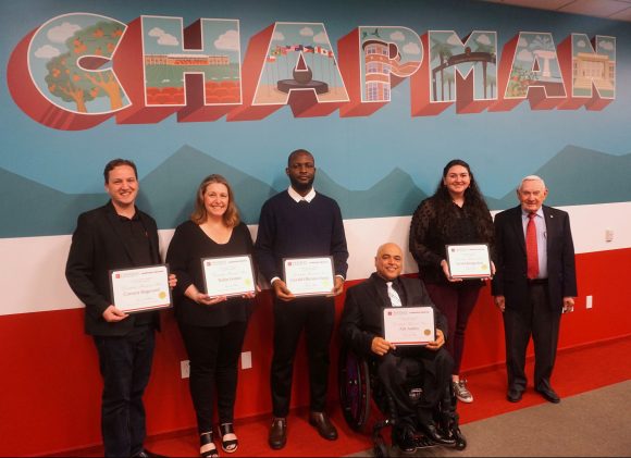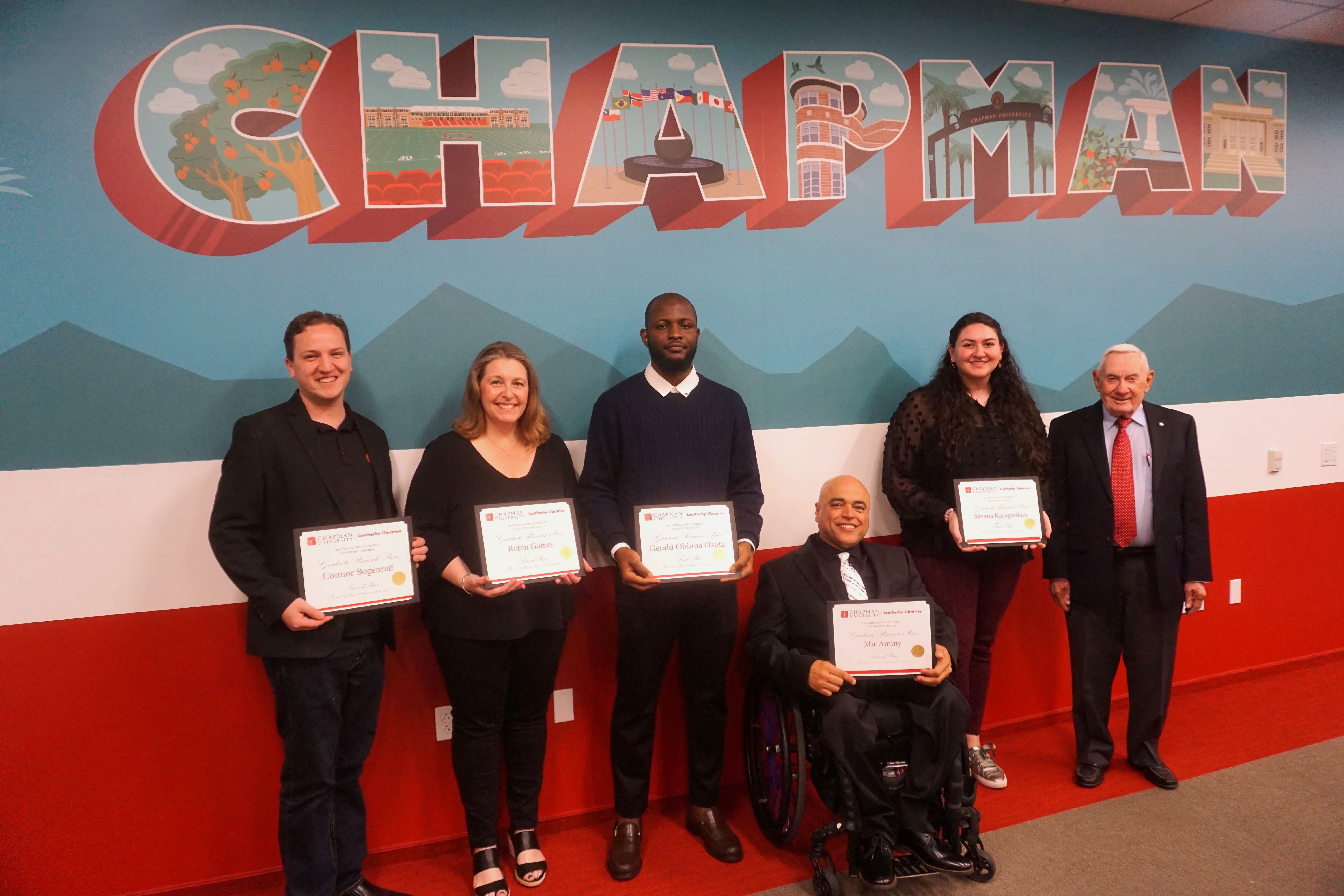 The Eric M. Scandrett Graduate Research Prize promotes and acknowledges excellent research and practical usage of library resources by Chapman graduate students. Eric M. Scandrett, the benefactor of this prize, is deeply integrated into the fabric of the Chapman University community. Eric has made significant contributions to the campus through his involvement with Sodexo catering services, the Town & Gown, and as a legacy donor for the Leatherby Libraries. We sincerely thank Eric for his continued support of this research prize and our graduate students and for being a valued friend of the Leatherby Libraries.