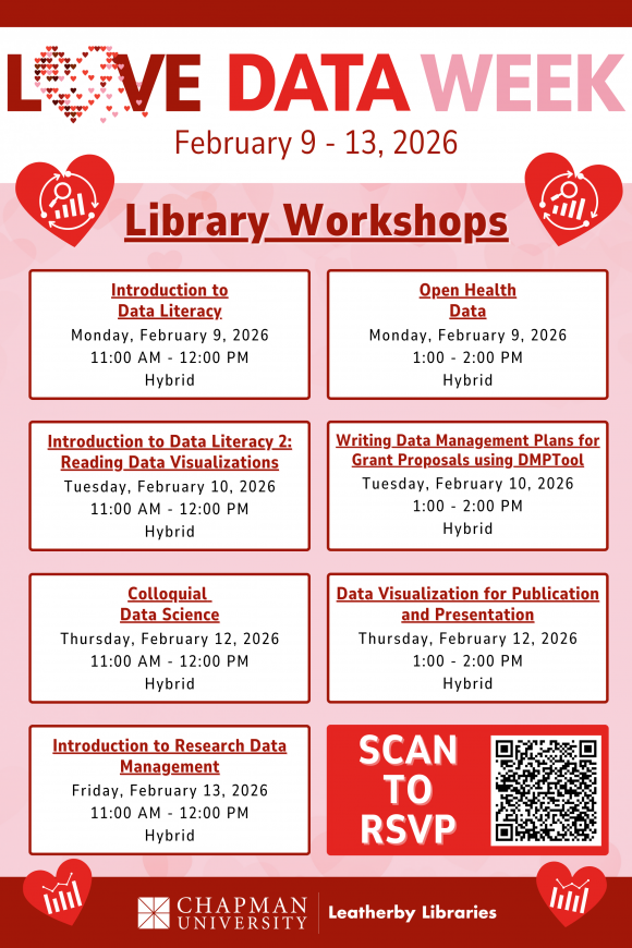 From February 9 to February 13, the Leatherby Libraries’ Library Research and Data Services (LRDS) team will have a range of data-related workshops and activities to enhance knowledge of data resources and services within the Chapman community. Continue reading to see how you can celebrate Love Data Week!