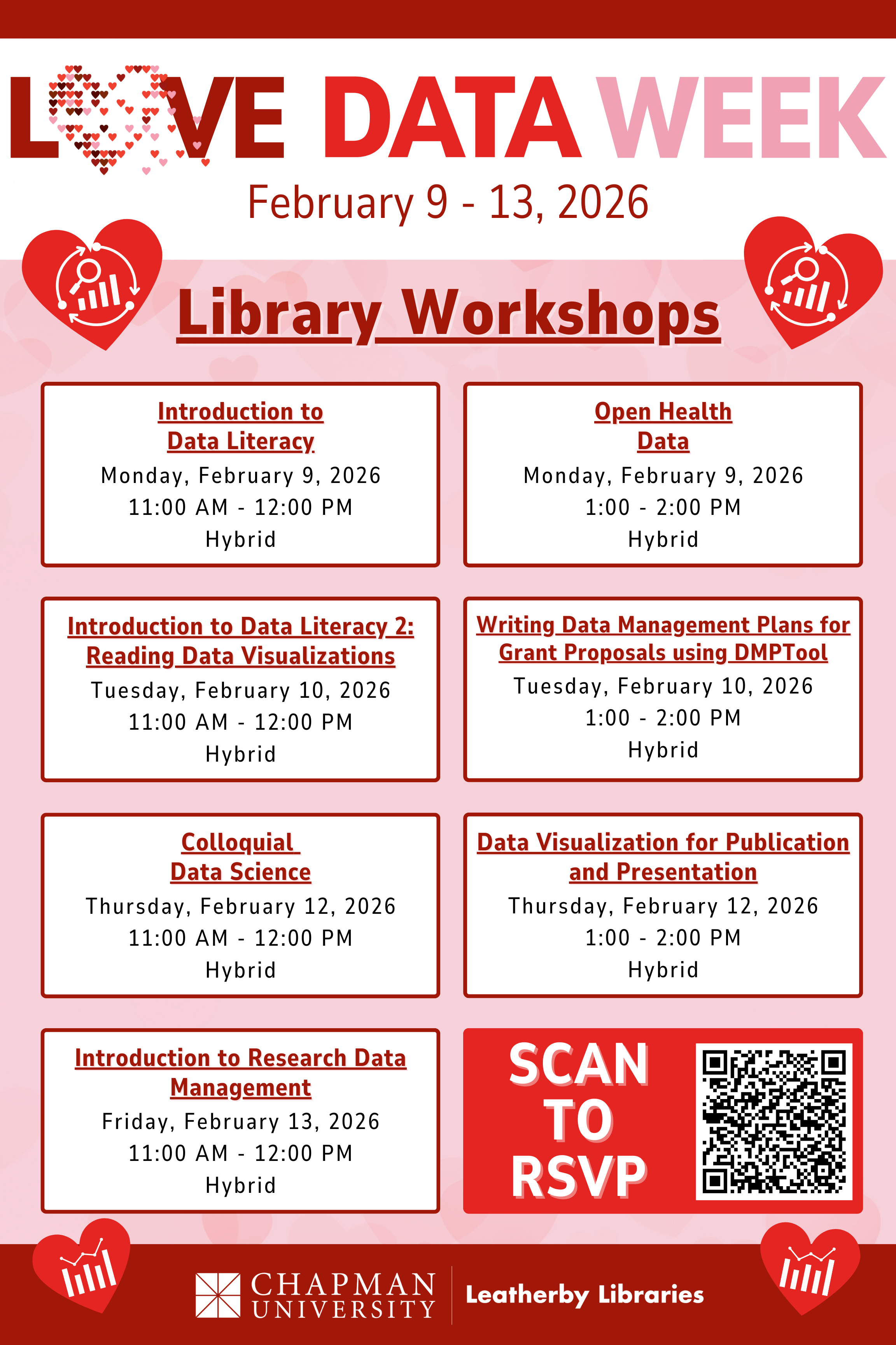 As we gear up for Love Data Week 2026, we invite the Chapman community to take advantage of these opportunities to understand and utilize the vital role of data in research. Mark your calendars for February 9-13, and let us celebrate the power of data together!