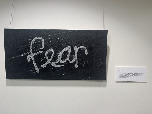 A sub-collection within the exhibit titled Shattered Stories presents phrases and conversational fragments arranged in fractured visual formats. These works provide a visual interpretation of how language may appear or feel to someone experiencing a language disorder. Words and sentences become disordered, incomplete, or overlapping, mirroring the internal experience of disrupted communication. By disrupting the expected structure of language, these pieces encourage viewers to pause and reconsider the effort and resilience required to communicate.