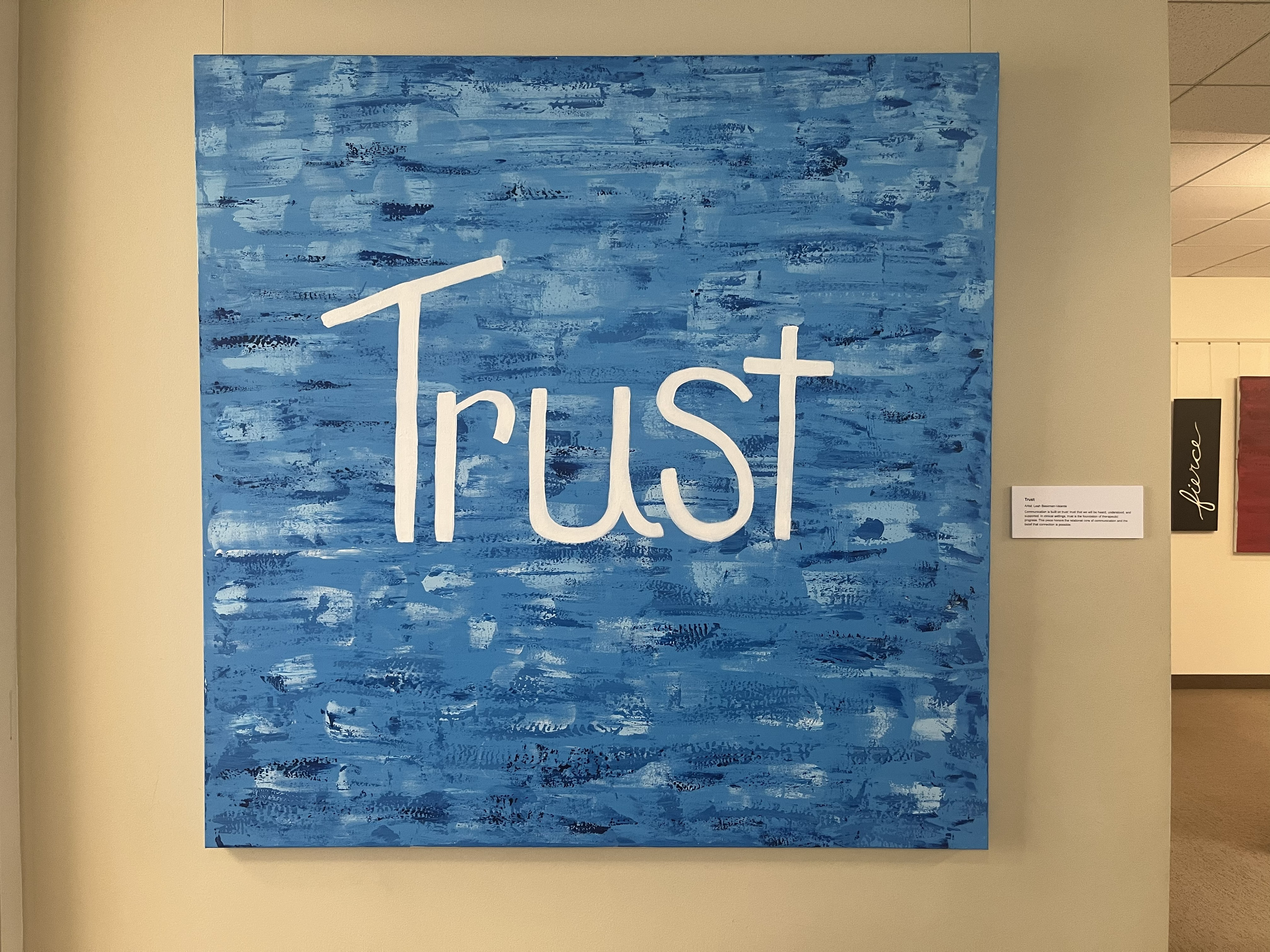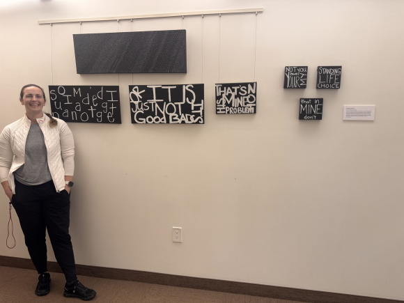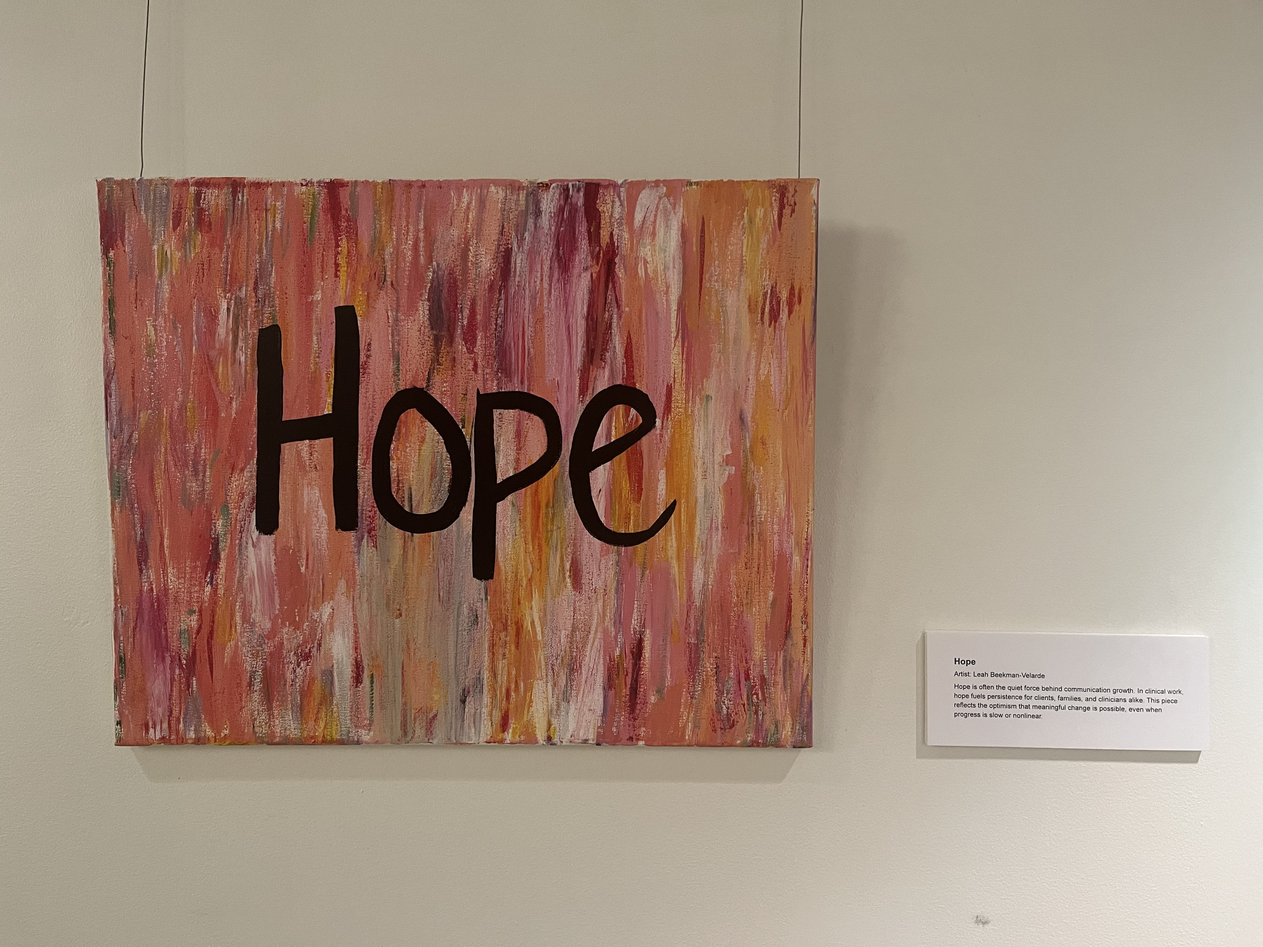 Dr. Leah Beekman-Velarde is a Clinical Assistant Professor in Speech-Language Pathology and a licensed speech-language pathologist with more than a decade of experience working primarily with pediatric populations. Her work explores how art can help make the field of speech-language pathology more accessible and emotionally resonant for those who may not have direct experience with communication disorders.Through this collection, she uses single words, phrases, and fragmented conversations to represent the lived experience of communication. Some pieces center on a single word, distilled, intentional, and resonant, capturing the emotional and cognitive weight behind communication. Other works appear fractured or jumbled, offering a visual interpretation of how language may feel inside the mind of someone navigating a language disorder. Together, the pieces explore the power, fragility, and humanity of communication and invite viewers to consider communication not as something automatic, but as something deeply shaped by experience.