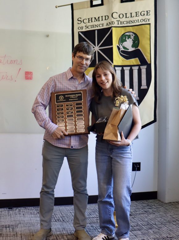 The annual Schmid College Awards Night was held on May 21, 2025. Students graduating with a bachelor’s degree in Schmid College of Science and Technology will earn program honors by meeting the following criteria: Students must have a major GPA of 3.500 of higher and must have completed independent research. Completion of independent research includes the submission of a scientific manuscript to the appropriate program faculty, oral presentation to the faculty, poster presentation at the Chapman University Student Symposium, and a vote by the appropriate faculty group that the research, paper, and presentation were of sufficient quality to merit honors. Contingent upon completing all requirements, the following students will receive Program Honors:
