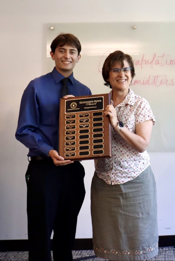 “This award is bestowed upon a vote of the biology faculty to the senior who has demonstrated the highest accomplishments in research,” said Dr. Hsu. “Borey has accomplished so much in the lab! He works with Dr. Hagop Atamian, conducting independent research on the genetics of drought-resistant plants, and has impressed me with his work and scientific accomplishments. He’s presented at several national conferences, including at the National Association of Biology Teachers and the American Society of Plant Biology, and is working on a first-author manuscript for his work. In addition, he has won both a Chapman Summer Undergraduate Research Fellowship and a Schmid Undergraduate Research Fellowship, demonstrating his accomplishments in research!”