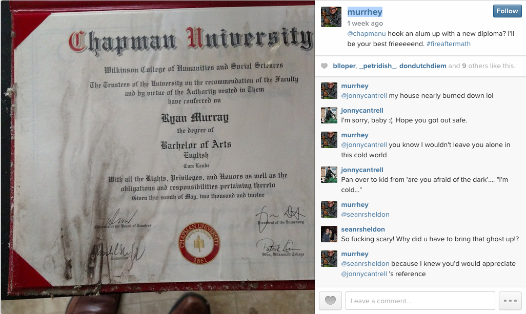 , for providing excellent Chapman Family service to alumnus Ryan Murray, whose Chapman diploma was destroyed in a structure fire. After Ryan posted about the incident on Instagram and Twitter, Michelle reached out to the Office of the Registrar and asked if they would send Ryan a replacement diploma, free of charge. They agreed and Ryan was thrilled!