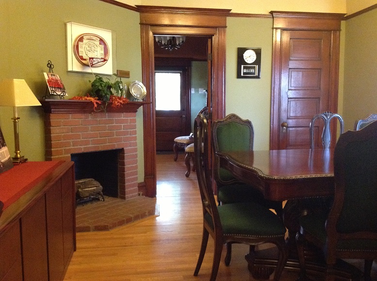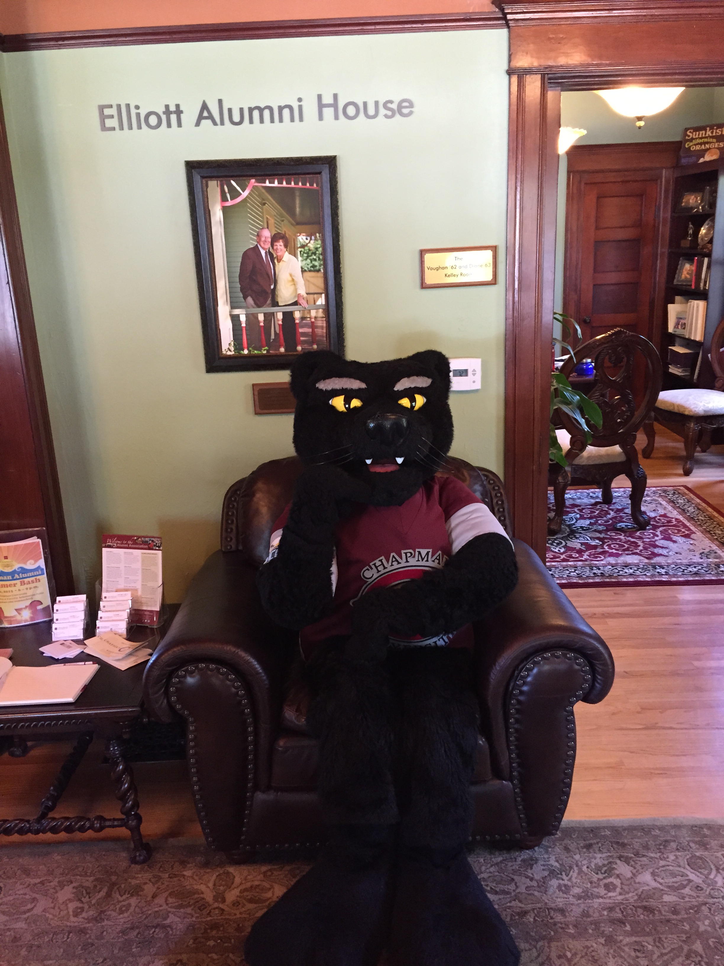 Many of the rooms throughout the house are appointed with antique furniture, which is especially appropriate for our location in Old Towne Orange, a hot spot for antique buyers and sellers. Personal touches include photos from Tom and Pat Elliott’s travels adorning the walls of the conference room and a lighted globe donated by President Doti that he used to have in his office. President Doti also donated a 19th century Austrian cabinet, which is located in the parlor and currently houses copies of the Ceer, Chapman’s yearbook.