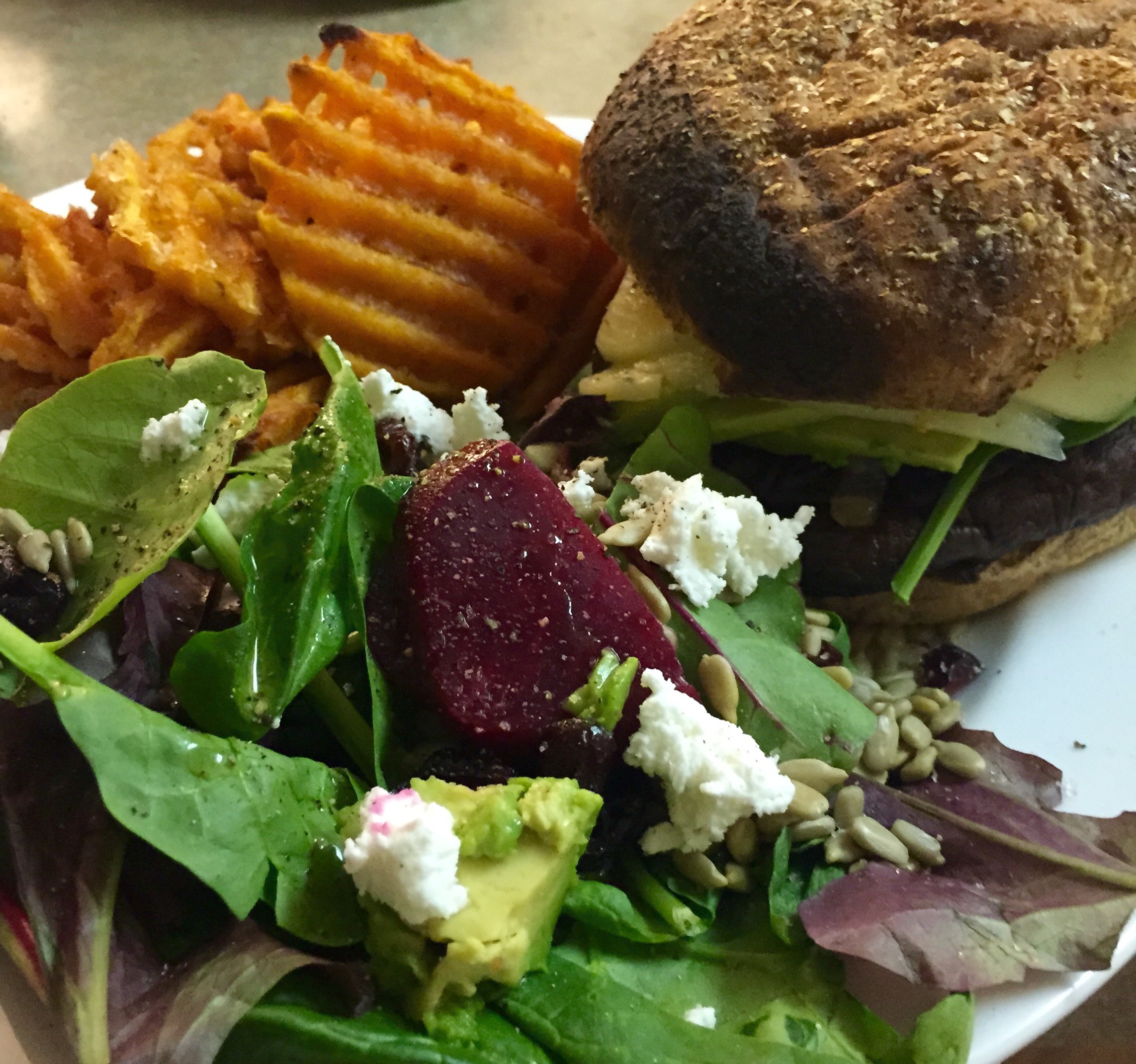 Grilled garlic pesto Portobello burger with caramelized onions…yum! These sweet potato fries are store-bought, but scroll down for a homemade sweet potato fries recipe!
