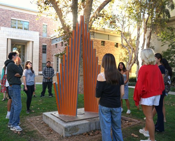 For the initial launch, the Escalette Collection’s Bloomberg Connects guide features two tours: an Outdoor Sculpture and Mural Tour and Sensation, an exhibition of work by Steve Roden on the third floor of Beckman Hall. The Outdoor Sculpture and Mural Tour guides visitors through campus, offering insights from artists as well as Chapman students, faculty, and staff. It explores the history of Chapman’s sculpture program and highlights themes of materiality and form. The Sensation guide centers on the student curators of the exhibition, who share their perspectives on the work on view and their experiences curating the show. Additional content highlighting other exhibition spaces across campus will be added in the coming months.