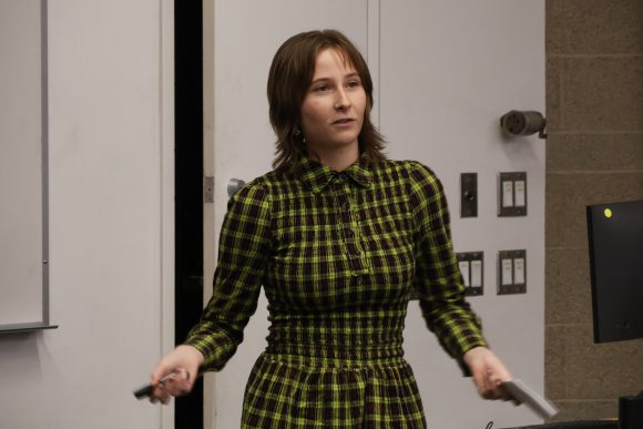 Maddi Andrews (‘28 History, Political Science; Anthropology) presenting her WIRE research work at the Wilkinson College Faculty and Staff Retreat. Photo by Ava Brandt (’27 Creative Writing, Documentary Film, and LGBTQ studies minor).