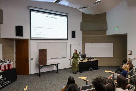 Pictured in header: Maddi Andrews (‘28 History, Political Science; Anthropology) presenting her WIRE research work at the Wilkinson College Faculty and Staff Retreat. Photo by Ava Brandt (’27 Creative Writing, Documentary Film, and LGBTQ studies minor).