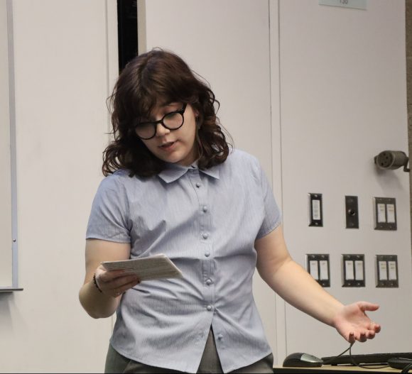 WIRE Student Fellow Gabi Fischthal (’26 Writing for Film and Television major, History minor) presenting their WIRE research at the Wilkinson College Faculty Retreat. Photo by Violet Gude (’29 Broadcast Journalism major).